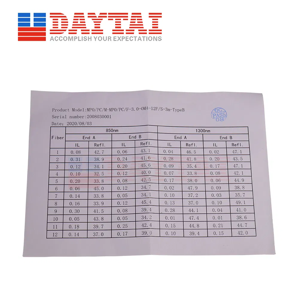 Description MPO Trunk Patch Cord,MPO Male to MPO Female Connector,8Core Multi Mode 50/125-OM4-550 ptical cable,cable diameter:3.0MM,LSZH,(Standard Loss: ≤ 0.7dB) or (Low Loss:≤ 0.35dB) is optional,Polarity Type:(Type A:TIA-568-C.3A),(Type B:TIA-568-C.3B),(Type C:TIA-568-C.3C) is Option......