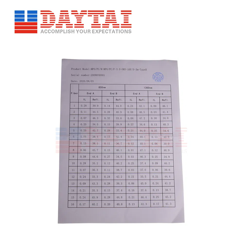 Description MPO Trunk Patch Cord,MPO Female to MPO Female Connector,16Core Multi Mode 50/125-OM3-300 optical cable,cable diameter:3.0MM,LSZH,(Standard Loss: ≤ 0.7dB) or (Low Loss:≤ 0.35dB) is optional,Polarity Type:(Type A:TIA-568-C.3A),(Type B:TIA-568-C.3B),(Type C:TIA-568-C.3C) is Op......