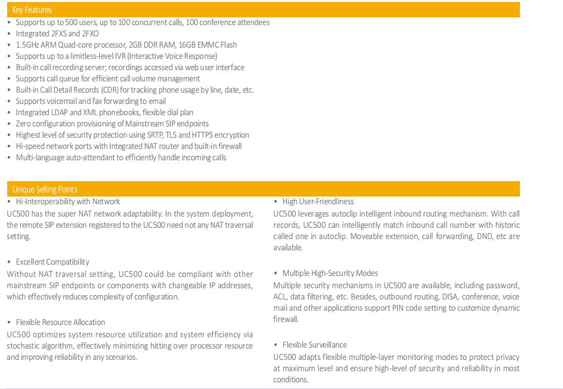 | Extension Trunk Inbound Routes Outbound Routes CDR Call Recording Call Forwarding Call Waiting Hotline Do Not Disturb Mobile Number Monitor Voicemail Fax Extension Security Communication without Power IVR Call Center Queue Conference AutoCLIP Ring Groups Intercept Groups Call Broadcasts Call Parking Blacklist DISA Callback Speed Dial Time Condition PIN Code |