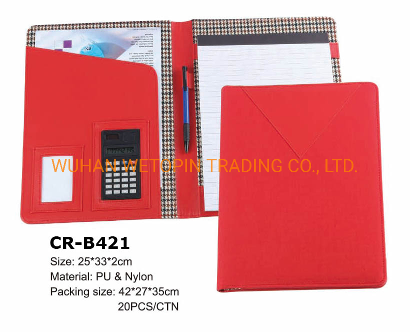 Item name:Folder with notepad, optional: with calculatorMaterial:BLACKSize (about):A5: 18.5 x 23 x 2 cm,to fit A5 notepad and paperA4: 25 x 33 x 2.5 cm, to fit A4 notepad and paperDesign constructure:Outside: brown PU+beige polyester jointInside: left-- file insert pocket, cards pockets, calculator......